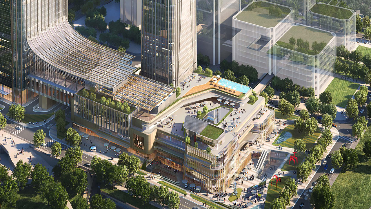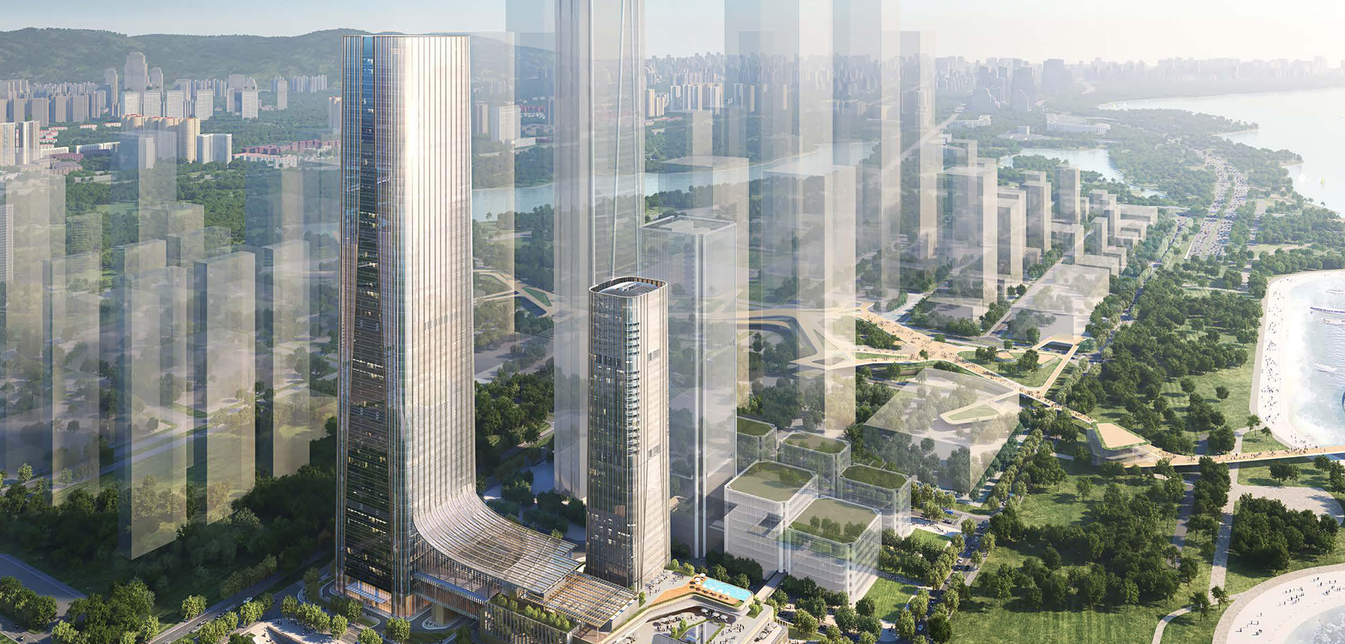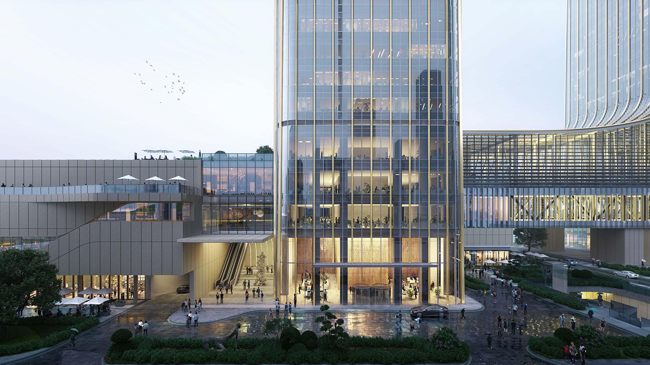 建筑高度:300米(A塔62層)、170米(B塔) 幕墻面積:12.97萬㎡ 項(xiàng)目設(shè)計(jì):美國Gensler建筑事務(wù)所 幕墻類型:單元式玻璃幕墻、框架式玻璃幕墻等