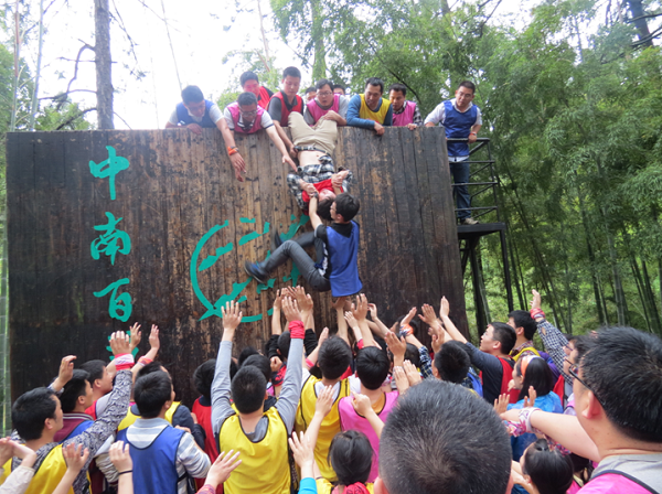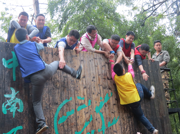 本次拓展訓練最感動人的項目莫過于最后的攀爬“畢業(yè)墻”,教官告訴大家:“沒有任何保險措施,什么道具都不能用,全隊學員必須在不違反規(guī)則的情況下,在規(guī)定的時間內(nèi)全部翻越畢業(yè)墻才算成功,拓展訓練才算畢業(yè)。”怎么辦?只有團隊的力量才能翻越畢業(yè)墻,最后大家協(xié)商是第一排四個,一人手扶墻,一人抱緊對方的腰,其他人踩著他們的肩膀上去,先爬上去的人再用手拉下面的人上去,每一位隊員心中都暗暗鼓勵自己要勇敢,踩上隊員肩膀的時候,身后有幾十雙有力的手托住,一股力量在支持我們向上攀越,一種從未有的安全感油然而生,也充滿了勇氣。當所有人出色的翻越過畢業(yè)墻后,大家的眼睛已經(jīng)濕潤了,最終的感動戰(zhàn)勝了辛苦。