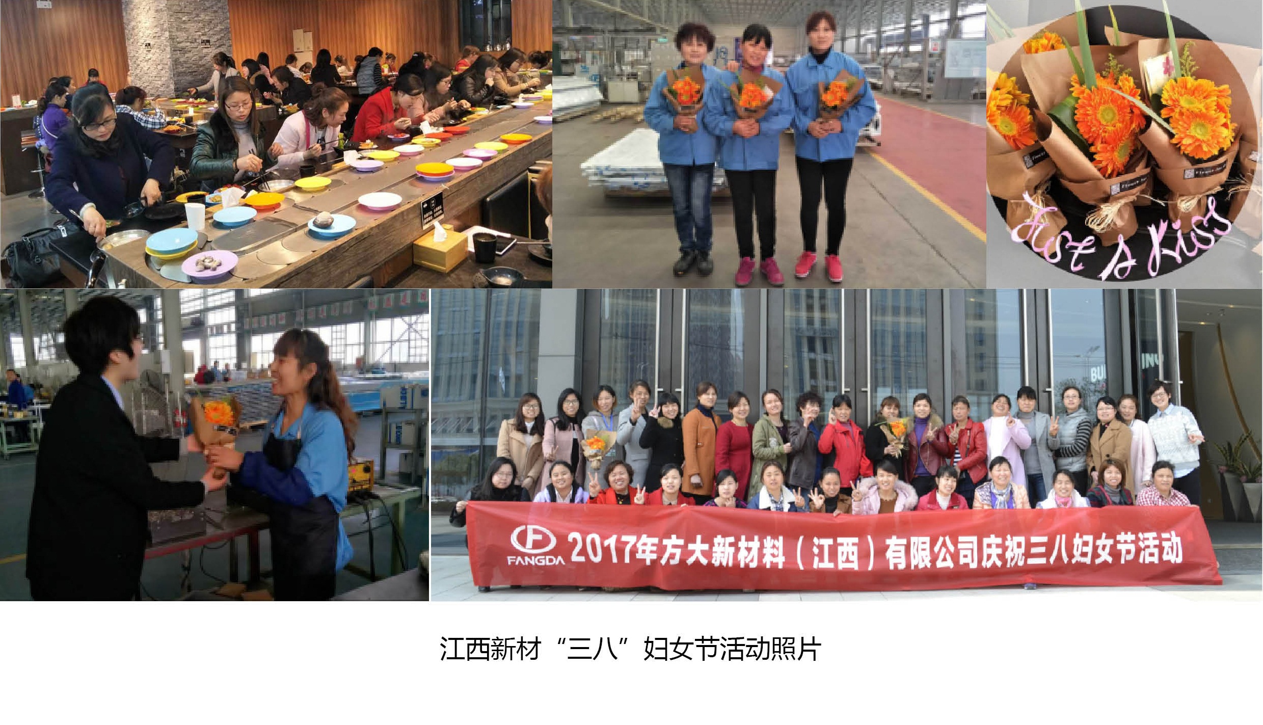 在南昌,江西新材組織了以“愛自己、愛生活”為主題的婦女節系列活動,共54名女員工參與其中。活動內容包括:向女同事送花、合影留念、自助火鍋用餐等。3月8日上午,江西新材行政人事部經理吳宇華帶領送花小分隊,向正在崗位上工作的各位女同事遞上一束艷麗的花,表達公司對女員工節日問候。中午時間,全體女員工在廣場合影留念,隨后前往一回旋自助火鍋店聚餐。江西新材以平凡簡單的方式,贏得了女員工們滿滿的感動。女員工們紛紛表示,今年的“三八”婦女節系列活動有驚喜、有創新、更有感動。