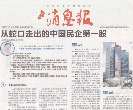 6月16日,《蛇口消息報(bào)》刊登題為“從蛇口走出的中國民企第一股”專訪文章,重點(diǎn)報(bào)道國內(nèi)首家上市民營企業(yè)——方大集團(tuán)股份有限公司作為蛇口精神的傳承者,成立26年來始終秉承“科技為本,創(chuàng)新為源”的經(jīng)營理念,不忘初心,砥礪前行,在節(jié)能環(huán)保領(lǐng)域不斷取得令人矚目的成就。當(dāng)前,方大集團(tuán)正積極參與“一帶一路”國際合作和“粵港澳大灣區(qū)”建設(shè),大力拓展海外市場,努力將方大高端幕墻系統(tǒng)、方大軌道交通站臺(tái)屏蔽門等創(chuàng)新成果推向全世界。
