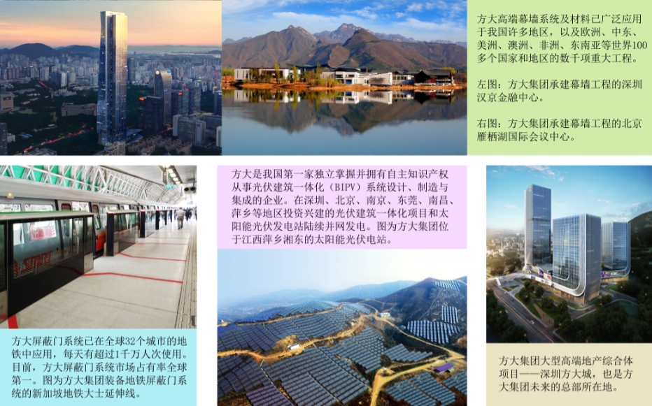 二十二年來,方大集團依托資本市場的力量,緊跟時代發展的步伐,精心布局,已成為擁有高端幕墻系統及材料產業、軌道交通屏蔽門系統產業、太陽能光伏產業以及房地產產業四大業務板塊的國內知名大型高新技術企業,在多個產業領域中為國家和社會做出了重大貢獻。方大集團在深圳、北京、上海、成都、南昌、東莞等地建有研發生產基地,在歐洲、中東、澳洲、非洲、東南亞等地設立了分支機構。