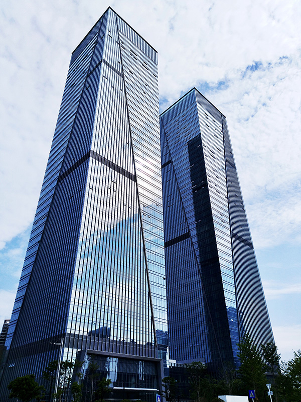 深圳·萬科濱海置地大廈位于深圳市福田區,幕墻類型主要是鋸齒狀單元式玻璃+石材+穿孔鋁板幕墻。項目塔樓采用L型和I型單元板塊組成,面板采用蜂窩石材、中空夾膠玻璃和穿孔鋁板。為了增強幕墻系統的通風性能,在穿孔鋁板后側設置了內開的鋁板窗。鋸齒狀的幕墻類型和特色材料的組合使該項目成為濱河大道上的一道靚麗風景,同時也給設計施工帶來了難題,項目團隊通過三維模擬確保L型板塊與I型板塊精確插接,對使用高度157m的蜂窩石材連接方案進行了加強措施,并順利通過幕墻專家專項的評審。