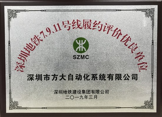 近日,深圳地鐵建設(shè)集團(tuán)有限公司授予方大集團(tuán)全資子公司方大智創(chuàng)科技有限公司(原深圳市方大自動化系統(tǒng)有限公司)“履約評價優(yōu)良單位”獎。