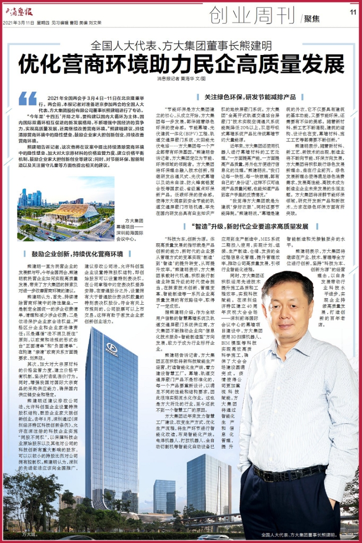 3月11日,蛇口消息報整版刊發方大集團董事長熊建明兩會專訪報道《全國人大代表、方大集團董事長熊建明:優化營商環境助力民營企業高質量發展》